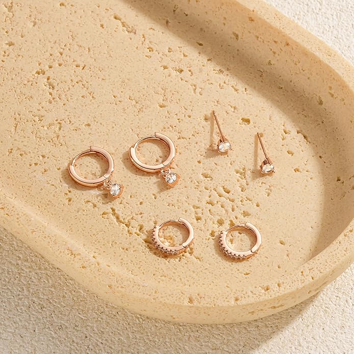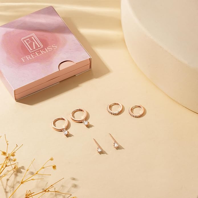 - Rose Gold Huggie Hoop Earrings Set: Unveil your elegant sense of fashion with our exclusive collection featuring 3 pairs of rose gold plated huggie hoop earrings. These small hoop earrings show combination of CZ huggies and hoop earrings designs