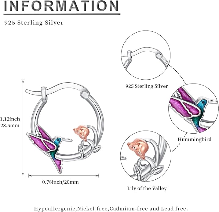 - Hummingbird Natural Language:The hummingbird spirit animal symbolizes the enjoyment of life and lightness of being. In these sterling silver hummingbird and lily of the valley round earrings, we have cleverly combined the spirit of nature with the softness of women. The earrings are carefully crafted from 925 sterling silver. The round design is simple and elegant. The hummingbird and lily of the valley flower pattern in the center bring vitality and vigor to these earrings