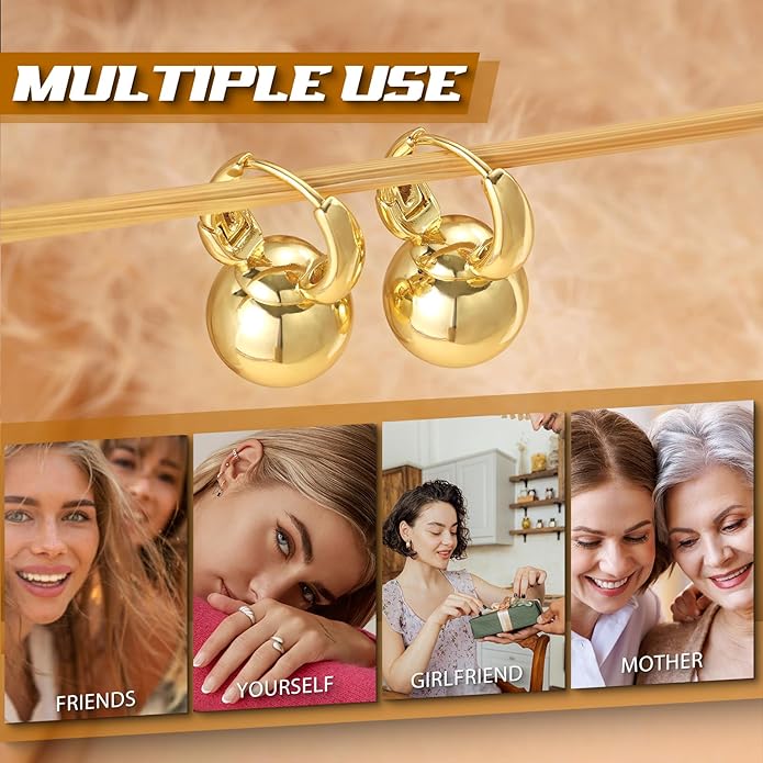 - GOLD BALL EARRINGS: These gold hoop earrings feature a shiny ball design with a secure clasp, ensuring they stay in place all day without causing discomfort. They are small enough to stay out of the way while adding a little delicate to your outfit
