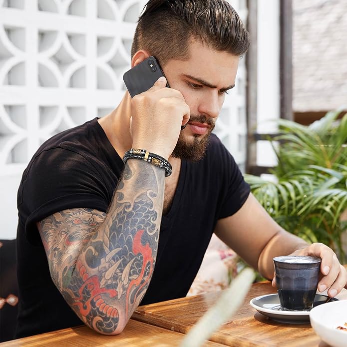 - 【Stackable Multiple Bracelet】Most men fit 8.3inches (average size), size 9 inches for wrists larger than 7.9 inches. Multi-layer bracelet braided in black premium leather, A classic style with luxurious details that will complement any style of outfit. More than a fashionable bracelet, it's a badge of wisdom and courage