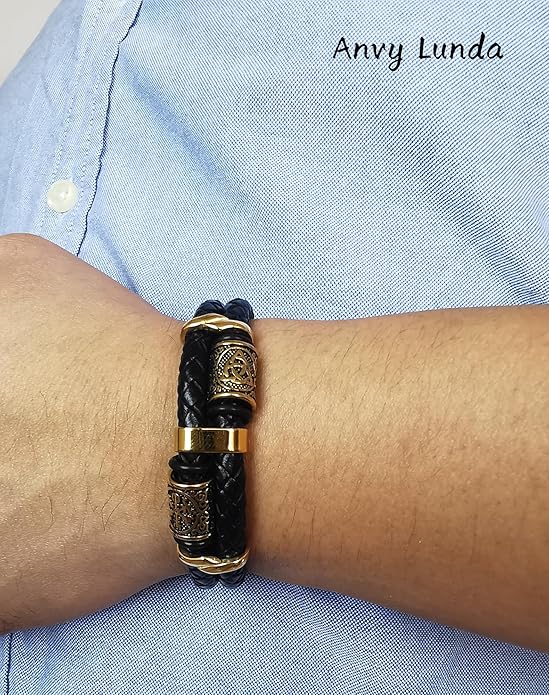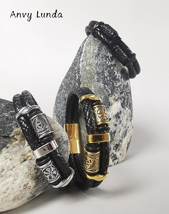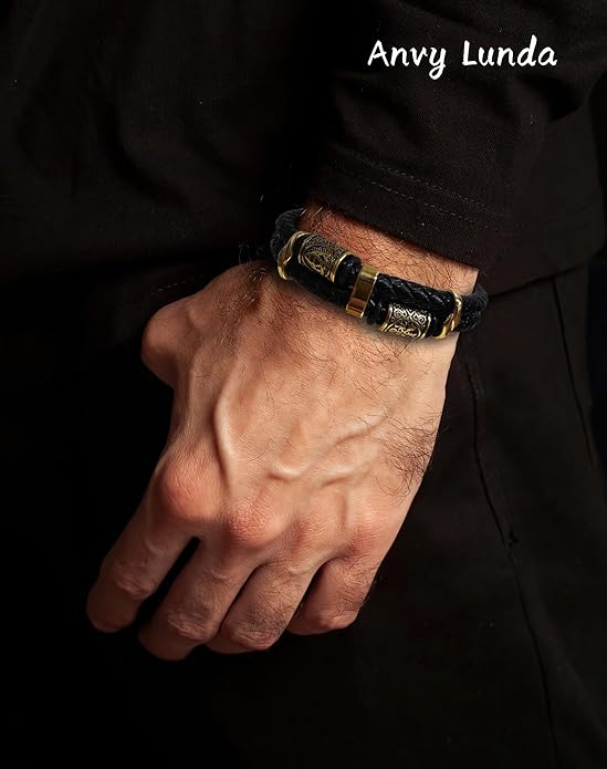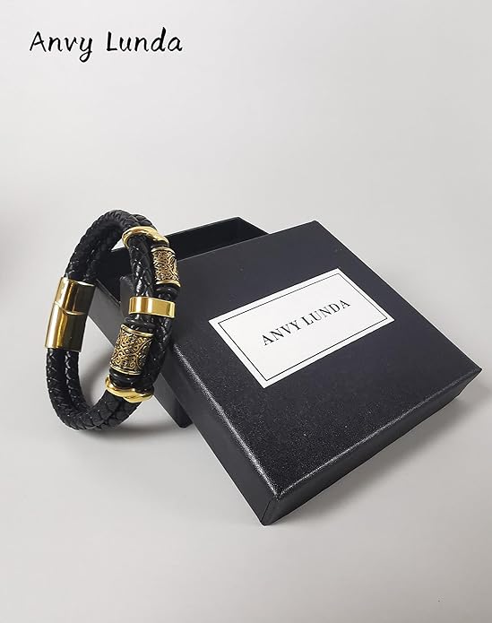 - DURABLE DESIGN: Anvy Lunda viking bracelet for men is made of high quality leather and 316L stainless steel, quality 14k yellow gold plated, withstand daily wear and tear while retaining its stylish look, long time color retention.