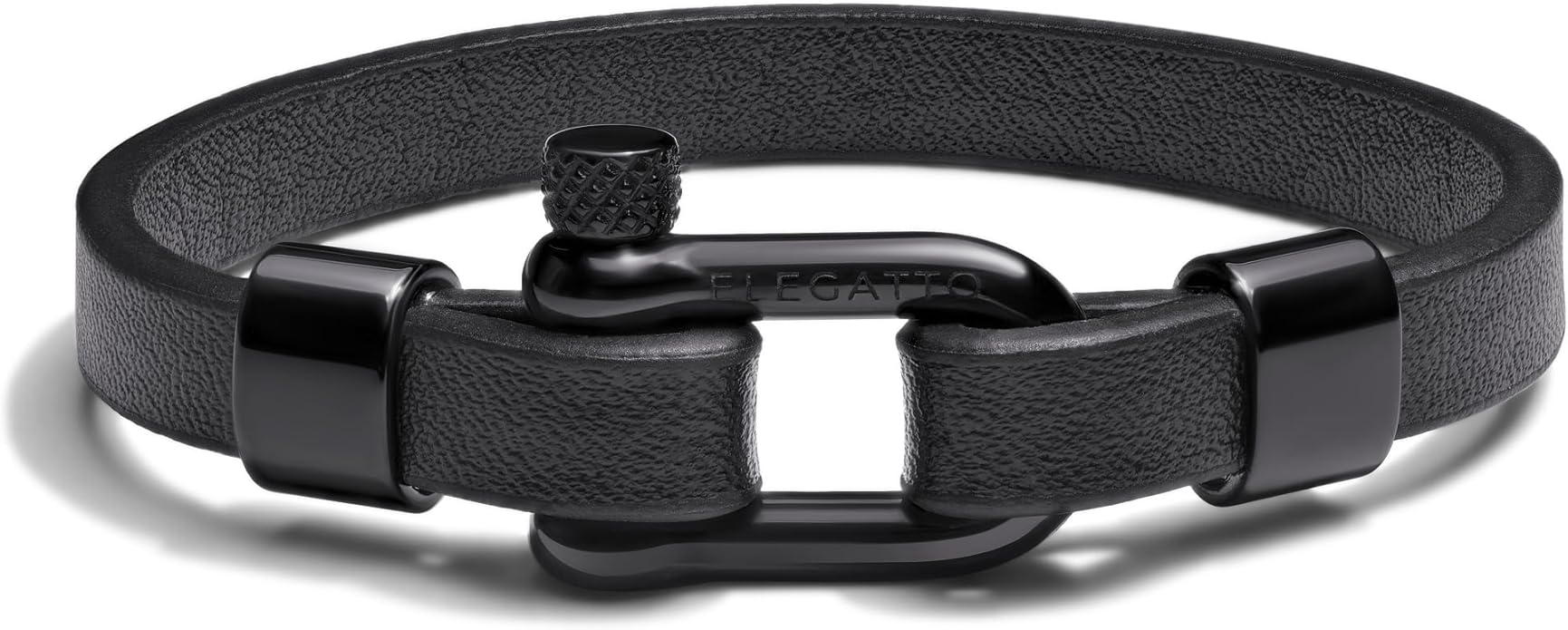 Elegatto Morelle Premium Leather Bracelet for Men | Full-Grain Black Leather with Silver Polished Stainless Steel Shackle Closure | Men’s Designer Jewelry