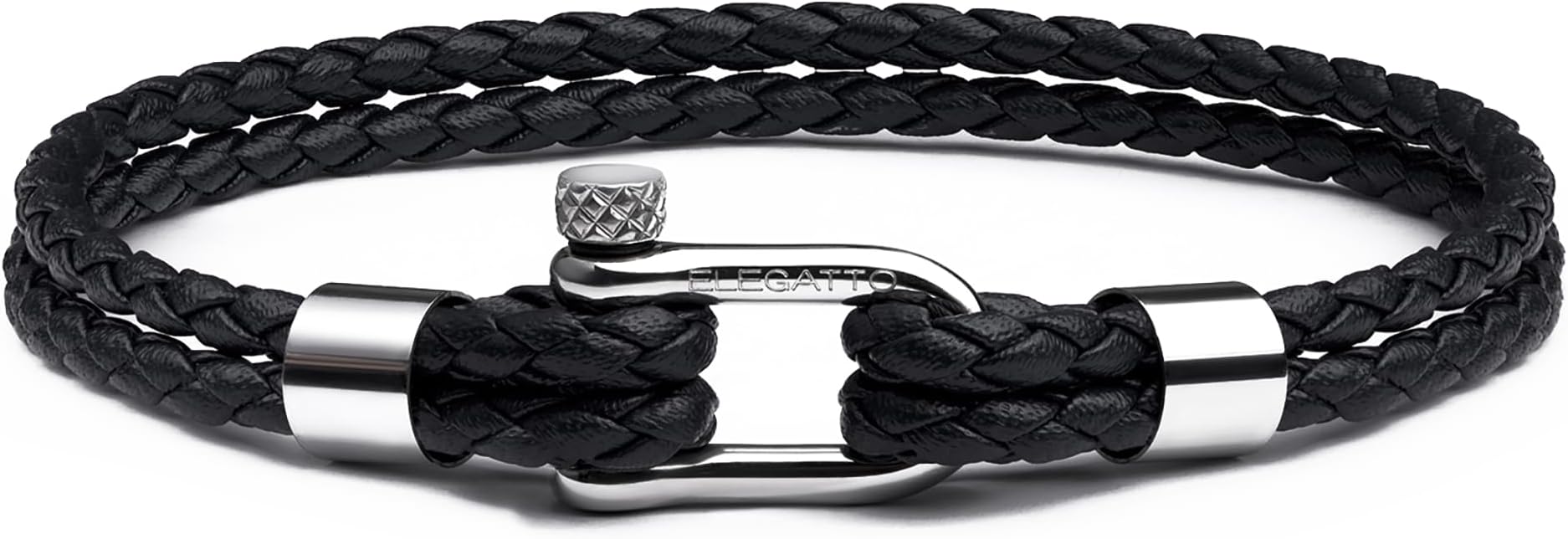 Elegatto Helix Premium Vintage Leather Bracelet for Men | Double Black Leather Strands with Sterling Silver Polished Mini Shackle Closure | Men’s Designer Jewelry