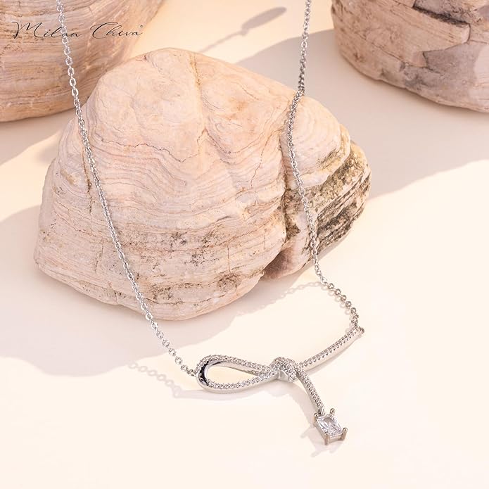 - Unique and Elegant Design: Silver knot cz pendant necklace,the pendant features a special zircon pave ribbon wrap design with white square zircon pendants underneath the twist that shimmers with the colors of the aurora borealis.