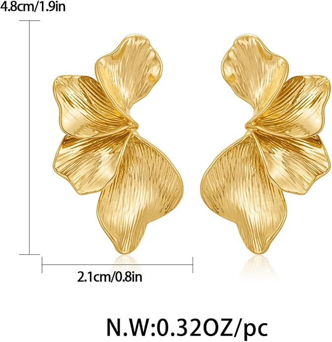 - Bold Floral Design: These large gold flower statement earrings feature an exaggerated leaf design, Nice for making a stylish impact.