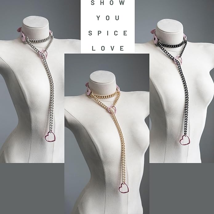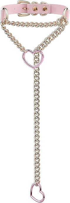 - CHIC DESIGN: This unique necklace seamlessly combines a leather collar with a slip-chain necklace design. Crafted from 3/4" vegan leather in Black/Pink, it features no nickel hardware available in silver, gold, or gunmetal. The design is completed with a Y-necklace that drapes below, adorned with charming heart O-rings.