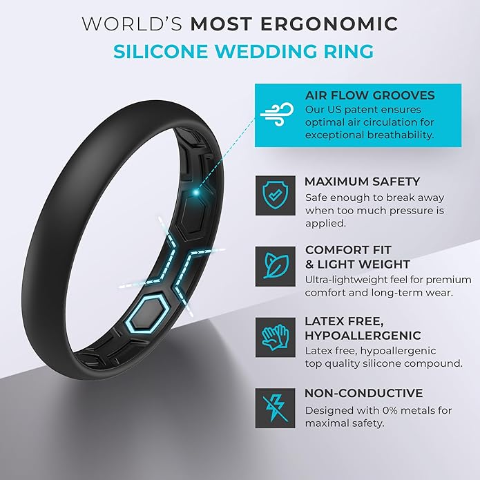 - TOP GRADE, HYPOALLERGENIC, FLEXIBLE SILICONE – Durable, yet flexible. Designed to break away when too much pressure is applied. The flexibility of this ring makes it also perfect for those with large knuckles or temporary swollen fingers.
