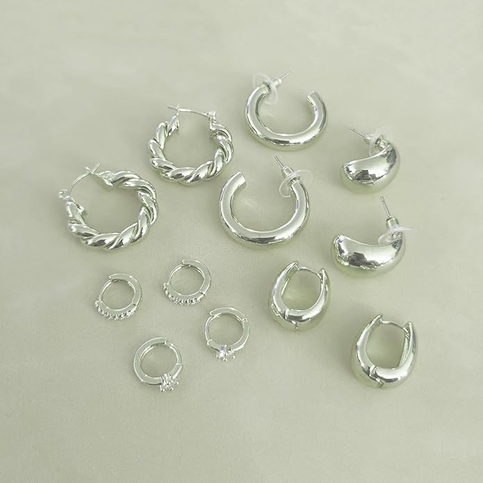 - ❤Trendy Earrings Set: There include 6 different styles and designs, such as croissants, tube, square hoops, twisted hoops, waterdrop dupes and chunky open huggies to choose from. One set can meet your various occasions. Make you more elegant and charming.