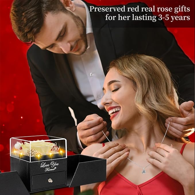 - šćIm Sorry Gifts for Her PackagećMother's Day Gift Ideas Preserved Roses are well wrapped in the gift box,so that you could give directly without spend time on package. As an exquisite luxury gift,it can also store other jewelry. The necklace can be worn, and the rose box can be placed indoors as an ornament,Your lover will feel happy every day looking at it. 1 Preserved Eternal Rose + 1 Gift Box + 1 Double Heart Necklaceļ¼With I Love Y