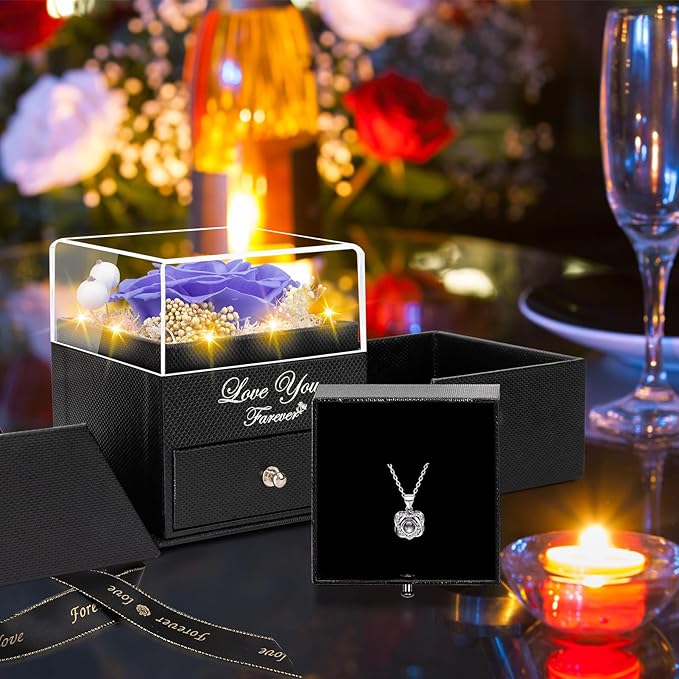 - ⤠ć Preserved Rose with NecklacećUnique double heart-shaped structure and is engraved with " I LOVE YOU necklace 100 Languages " to express love to her. The two hearts are tightly intertwined, symbolizing the love for each other and it will be an exclusive gift for her.The i love you necklace on hidden inside bottom of the rose box, as a romantic gifts for her, Unique design of double love "I LOVE YOU necklace" and gift box preserved rose, gift Ideas for women for every romantic occasion.