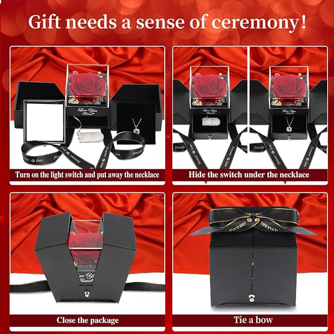 - šćIm Sorry Gifts for Her PackagećMother's Day Gift Ideas Preserved Roses are well wrapped in the gift box,so that you could give directly without spend time on package. As an exquisite luxury gift,it can also store other jewelry. The necklace can be worn, and the rose box can be placed indoors as an ornament,Your lover will feel happy every day looking at it. 1 Preserved Eternal Rose + 1 Gift Box + 1 Double Heart Necklaceļ¼With I Love Y