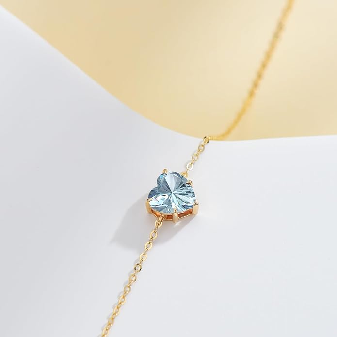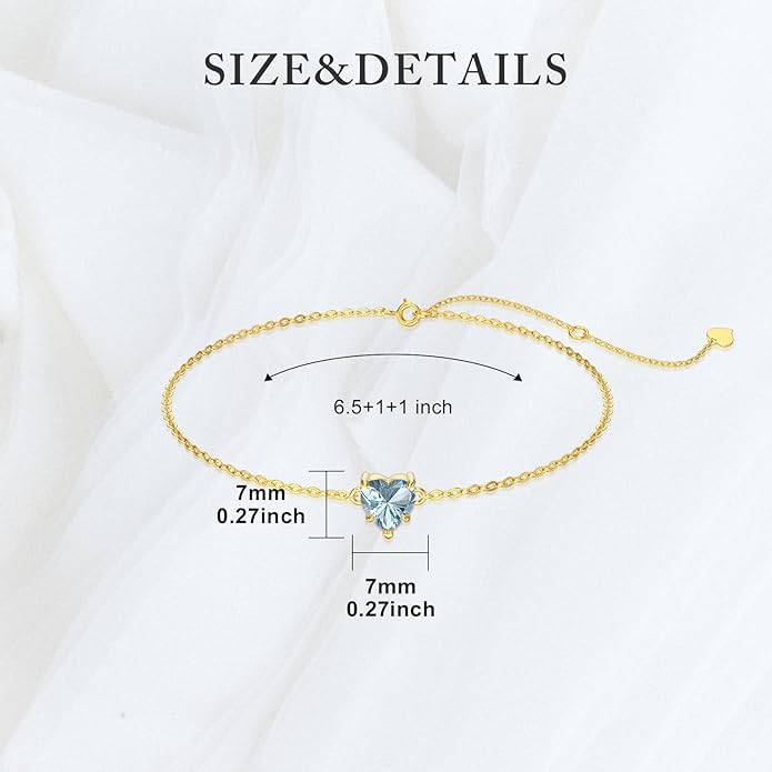 14k Gold Love Heart Gemstone Bracelet for Women,7MM Heart-cut Created Birthstone Anniversary Birthday Mother's Day Bracelets Jewelry for Mom Her 6.5''+2''