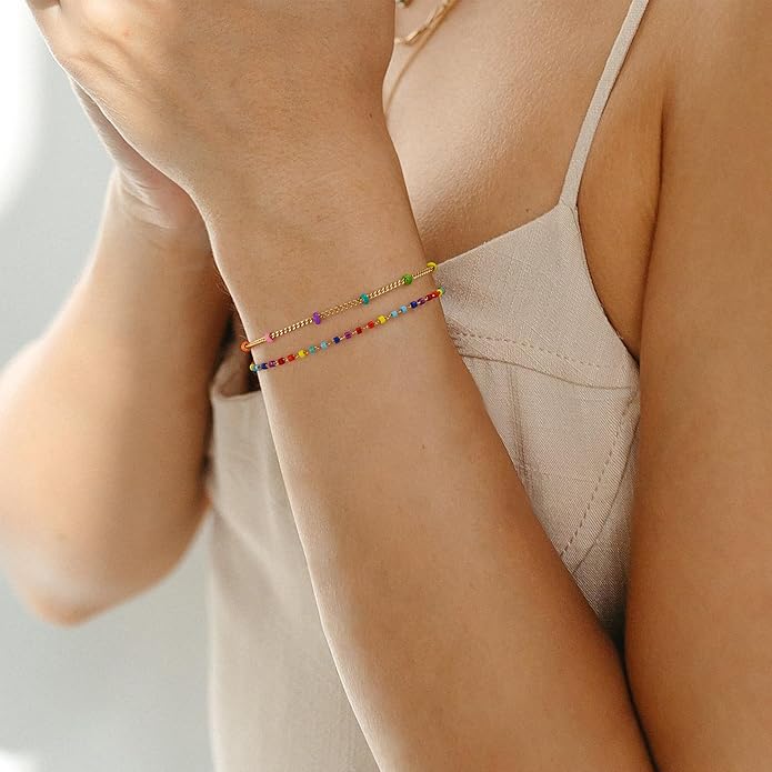- Elegant Double-Layer Design: This gold double-layer bracelet features a delicate gold chain and vibrant, colorful balls, creating a chic and eye-catching accessory that complements any outfit, whether casual or formal