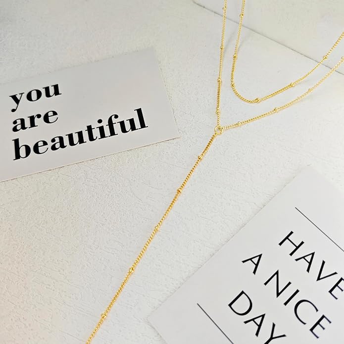 Luxval Lariat Gold Necklace for Women, Dainty Long Necklace 14k Gold Plated/Silver Y-Shaped Pendant Necklaces Trendy Beaded Chain Drop Necklaces Jewelry for Women Gifts
