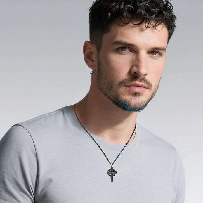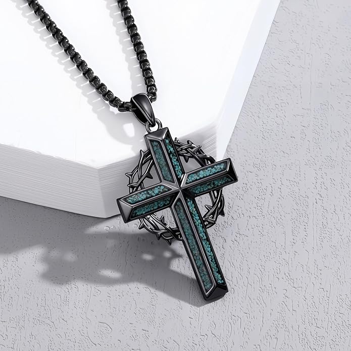 - Black Crown Cross Necklace Material: The turquoise cross necklace for men is made of 925 sterling silver decorated with turquoise, the chain is stainless steel and does not contain any allergenic elements, hypoallergenic and safe for sensitive skin. The intricate detailing and sleek finish make them a standout accessory for any occasion