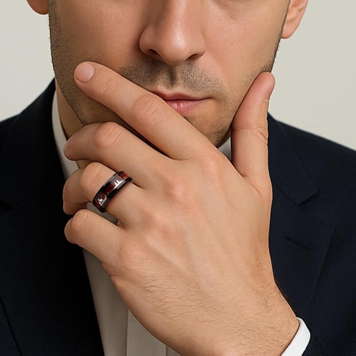 - High Quality and Durable: These engagement rings for men are made of high-quality tungsten steel with a wood inlay, polished and covered with protective coating. The mens comfort fit wedding bands are sturdy. The tungsten steel is embedded tightly with the wood, which is resistant to rust, non tarnish, not easy to break off. If it sticks to stains, just gently wipe the surface of the tungsten carbide rings for men with a clean cotton cloth to remove it