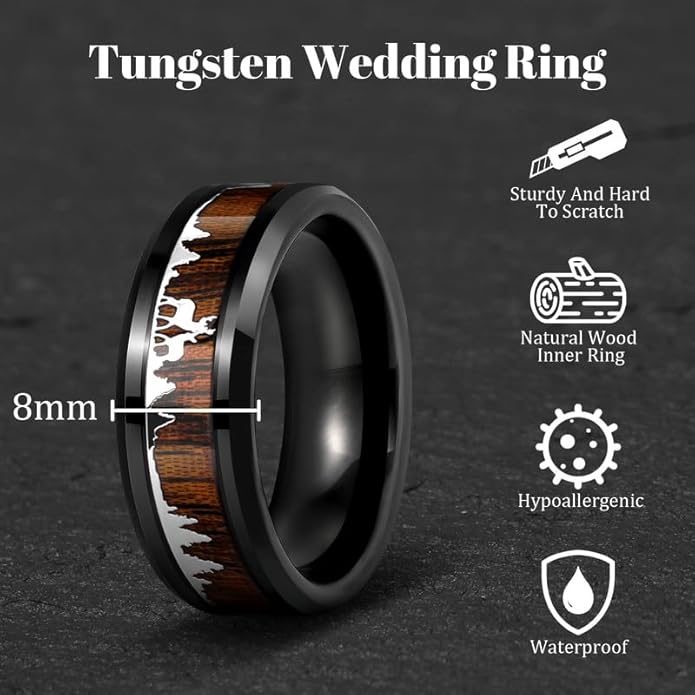 Mens Wedding Band Tungsten Rings: 8mm Black Tungsten Rings for Men Wood Wedding Ring Band for Man - Silver Ring for Men Wedding Bands for Women Wood Promise Rings for Him