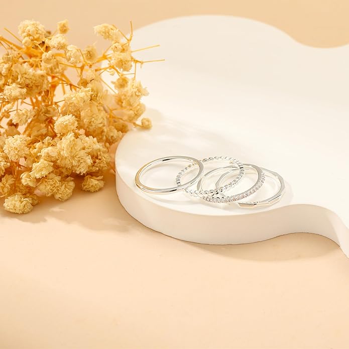- Fashion Women Ring Set: 4 rings of different designs in each set. Gold and silver are available for selection. Each thin ring has its own unique design elements, fashion and minimalist. These lovely stackable rings can be worn alone or stacked to highlight your slender fingers and showcase your elegance and charm.