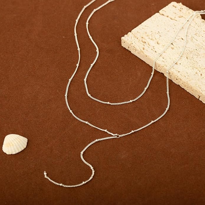 - Lariat Necklace for Women Design: This elegant silver lariat necklace features two satellite chains of different lengths that drape gracefully along the neckline, creating a chic and elongated effect. Perfect on its own or layered with other necklaces, it adds a refined touch to any outfit.