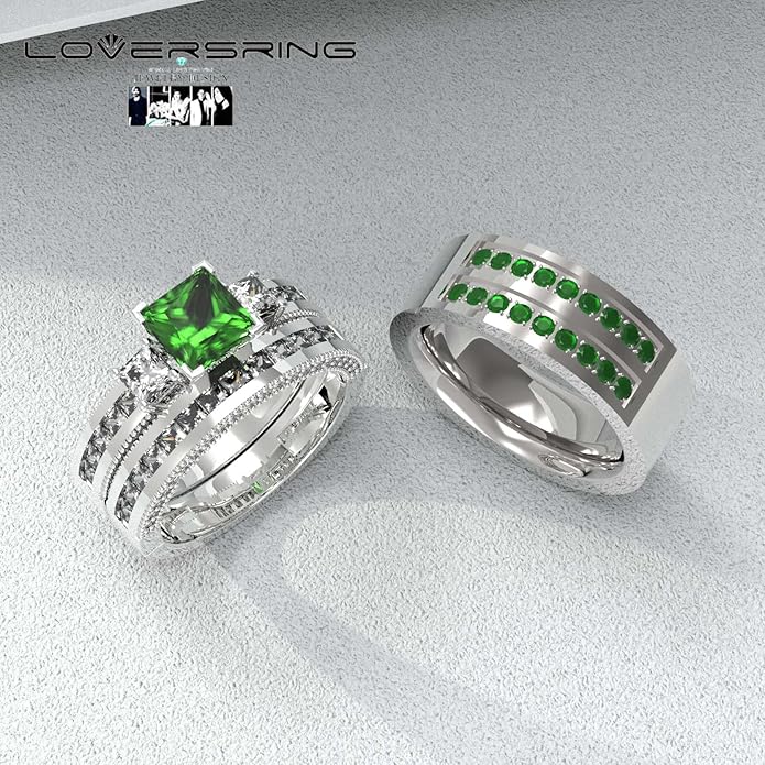 TWO RINGS Wedding Ring Sets His And Hers Promise Ring Couples Bridal Sets Women 925 Sterling Silver square Cz Man Stainless Steel Brushed Finished Wedding Bands