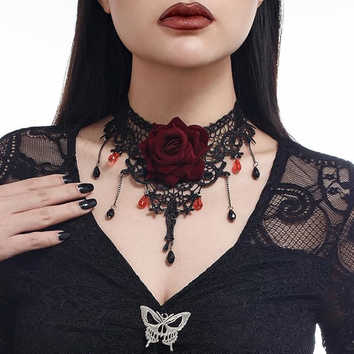- Black Lace Choker Necklace for Women:This black lace necklace exudes the spirit of Halloween and an astonishing style;Vintage combines elegance and mysterious charm;The core part of this necklace is a delicate black lace necklace with red or black crystals on the surface;The mysterious and elegant Gothic necklace has become an indispensable piece of jewelry for Halloween