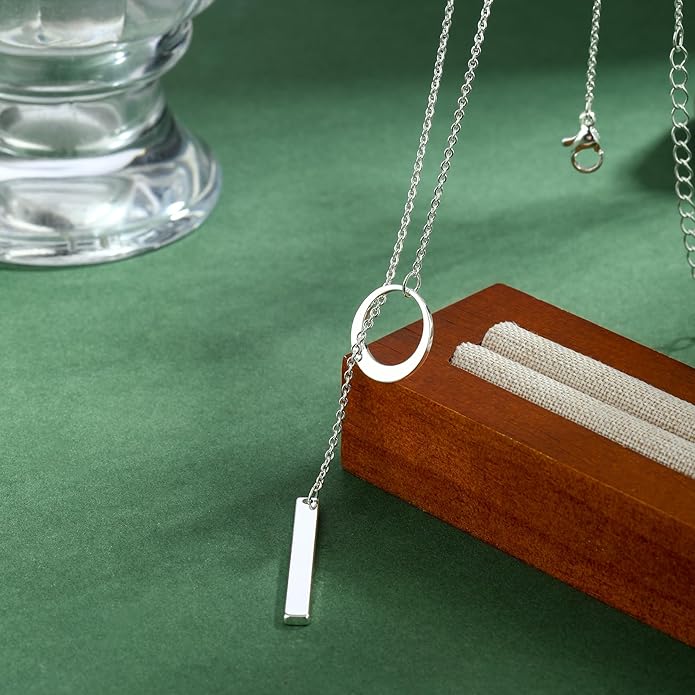 - Size: Y silver necklace is 18 inches with 2 inches extender, drop bar size: 1 inch, thickness: 3mm*1mm. The stick pendant end loops inside the circle on the other end, offering a modern and minimalist aesthetic. (Note: Be careful to slide off when wearing slip chain necklace.)