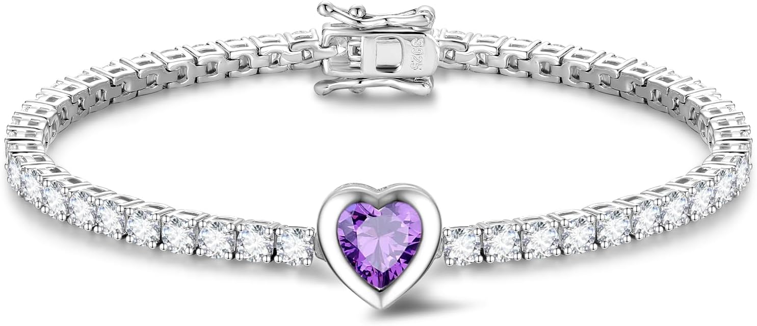- ✦Heart-shaped Tennis Bracelet✦ This elegant bracelet features a striking heart-shaped Amethyst as center stone, beautifully accented by bezel-set round CZ for extra brilliance and security,representing woderful love,The classic double safety clasp ensures a secure fit, blending timeless style with everyday durability.