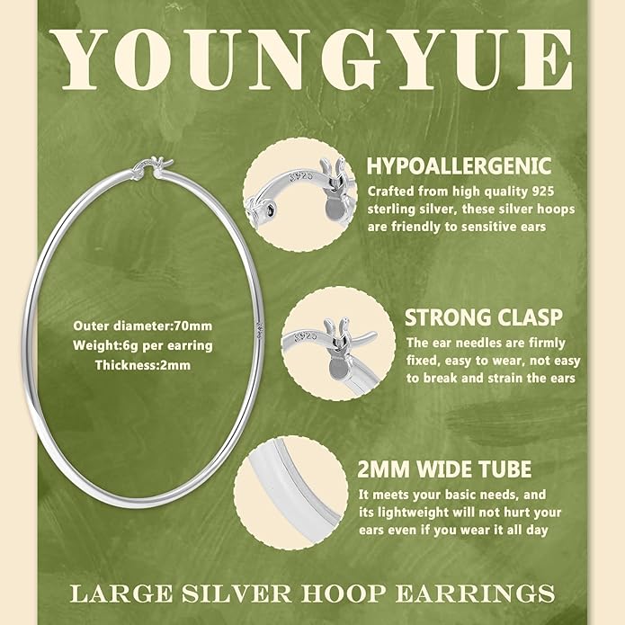 YOUNGYUE 925 Sterling Silver Hoop Earrings for Women Hypoallergenic Oversize 14K Gold Hoops Earrings for Women Thin Gold Plated Hoop earrings Lightweight Large Silver Hoop Earrings 30/40/50/60/70mm