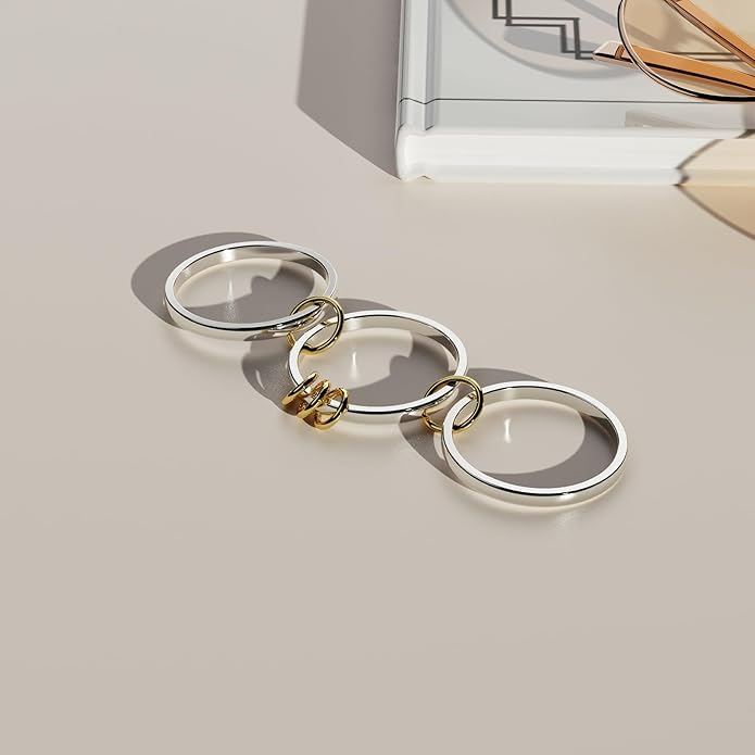 - Modern Jewelry Aesthetics: This stackable ring features a multi ring dual color metal interwoven structure, consisting of three independent silver rings connected by two small gold rings arranged in a spiral pattern, creating a visually layered three-dimensional effect. The equal width design of the three rings and the contrast of gold and silver highlights the minimalist style, which is low-key yet high-end, making it very suitable for wearing in both daily and formal occasions.