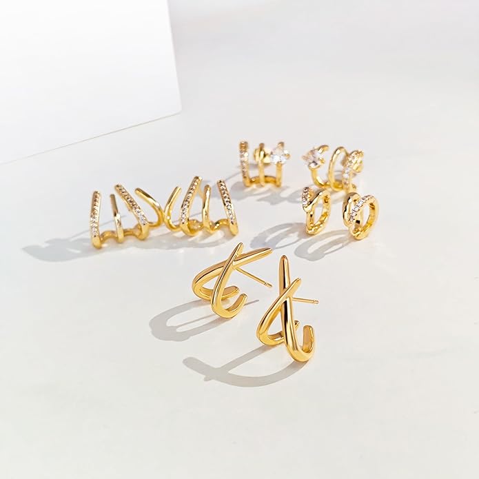 14K Gold Plated Hoop Earrings for Women Triple Huggie Illusion Stud Earring | Double Huggie Hoop Earrings for One Hole | Claw Ear Cuff Earring Jewelry Gift for Women