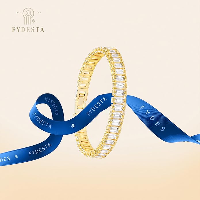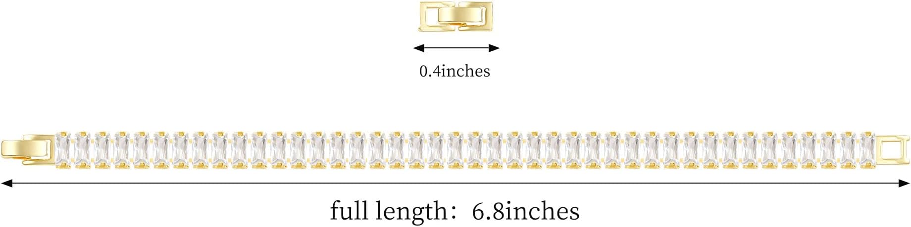 - Chic & Sparkling Design This tennis bracelet for women features a row of baguette-cut cubic zirconia stones, radiating light from every angle. Finished in sleek 14K gold plating for a refined and polished look.