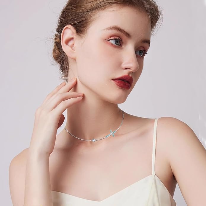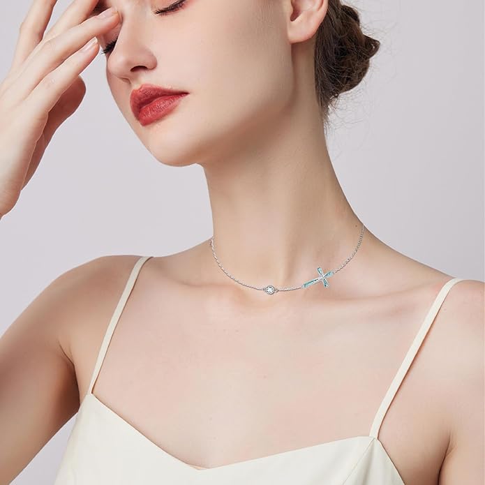 - Choker Cross Necklaces Silver Design: The sideways cross necklace is a timeless symbol of faith, strength, and hope. Cross pendant combined with turquoise, merging spiritual meaning with natural beauty. Its simple yet elegant design makes it a meaningful christian jewelry