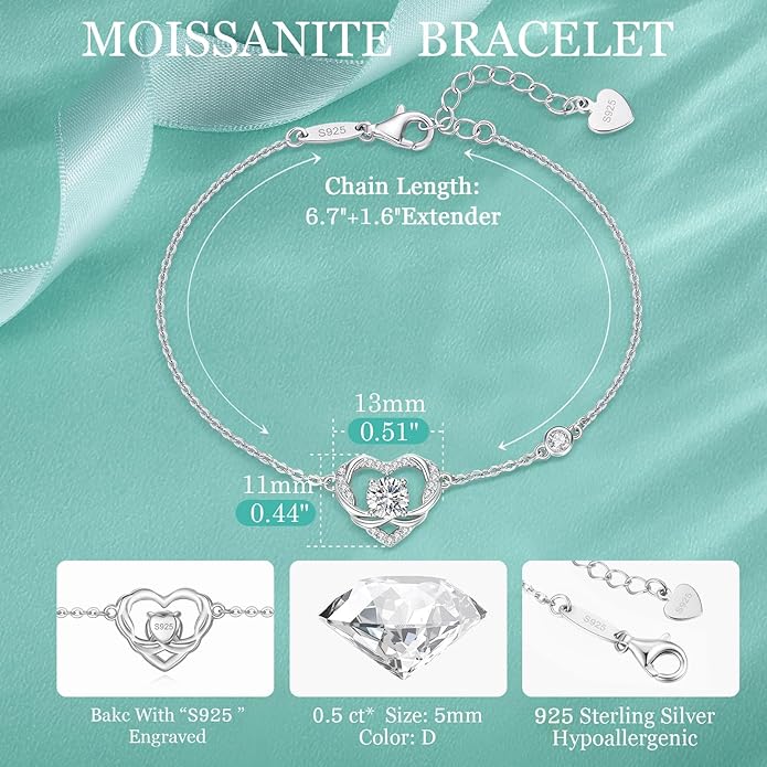 - 【925 Sterling Silver】:The moissanite heart bracelet is made of 925 sterling silver, available in three refined metals - bright 925 hypoallergenic silver, warm 18k gold plated, romantic rose gold plated Our lab created diamond bracelets for women is lead-free, nickel-free, and hypoallergenic, you can wear it daily without worry of irritation or discoloration
