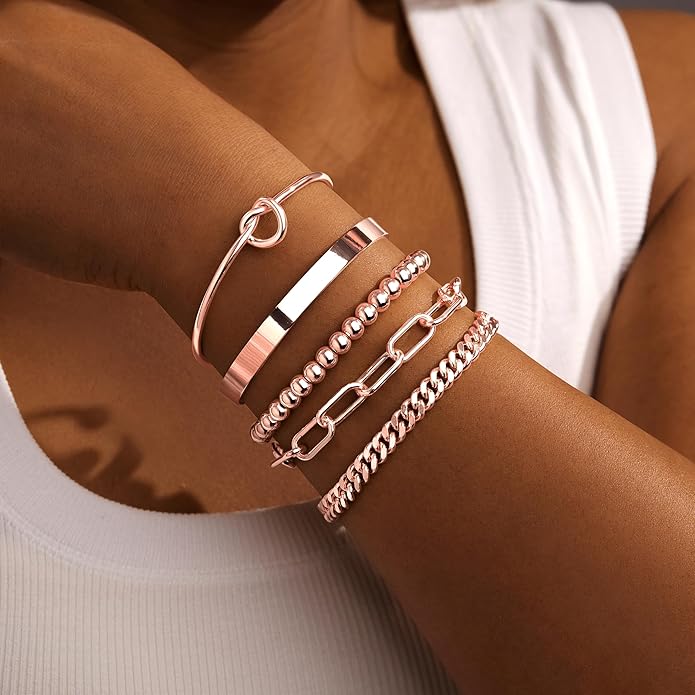 - 【Endless Mix-and-Match Possibilities】Create a personalized look that’s uniquely yours! This rose gold bracelet set includes love knot designs, sleek cuffs, beaded strands, paperclip chains, and a chic rope bracelet. Layer, stack, and reinvent your style every day