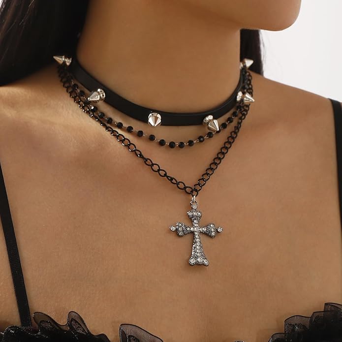 - Intricate Crystal Cross Pendant: The centerpiece is a meticulously crafted vintage-style cross pendant adorned with shimmering black crystals, adding a touch of dark elegance and symbolic detail