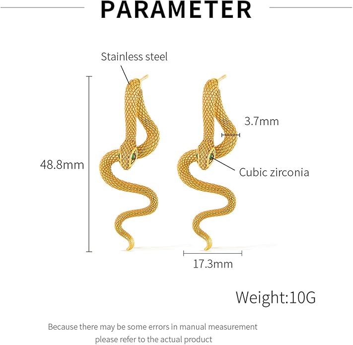 - Size: The snake earring measures 1.7cm x 4.9cm/0.68in x 1.9in, with a single weight of 5g. It is lightweight and comfortable to wear