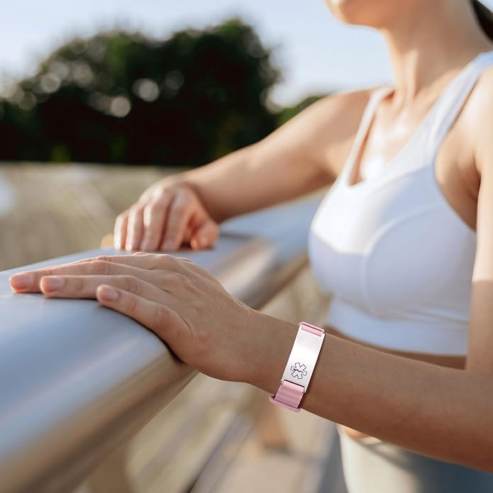 - š(Tips:For a more secure fit, try threading the band from the outside in )Adjustable & Comfortable Fit:The medical alert bracelet features a flexible silicone strap, allowing you to easily adjust it for a perfect fit. Crafted from premium silicone, our band is soft, skin-friendly, and waterproof, Additionally, it's scratch-resistant, wear-resistant, and easy to clean, maintaining a fresh, new look even with everyday use, making it suitable for both men and women.