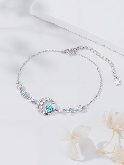 - March Birthstone Moon and Star Bracelet:Aquamarine is the March birthstone,represents composure and bravery,happiness and longevity