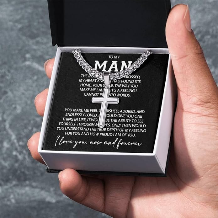 - ✨ Meaningful Gift for Him: Show your love and commitment with this elegant To My Man Promise Cross Necklace. A timeless Cuban link chain paired with a classic cross pendant, designed to remind him of your unbreakable bond every day.